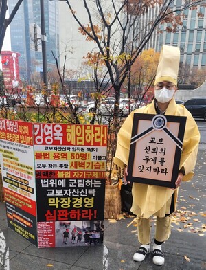 가을비가 내리는 25일 아침, 서울 강남 교보자산신탁 본사와 성북동 교보생명 신창재 회장 자택 앞에 구슬픈 상여소리가 울려 퍼졌다.경기 용인시 '죽전테라스앤139' 사업의 시행사(보정PJT) 임직원들이 흰 상복을 입고 거리에 나선 것이다. 이들은 빗속에서 '죽어버린 상식과 정의'를 애도하는 퍼포먼스를 벌이며, 사태 해결을 위한 교보 그룹 차원의 결단을 촉구했다.영정 속에 담긴 건 '사람' 아닌 '신의'이날 시위 현장에는 작은 앉은뱅이 책상 위로 영정틀이 세워졌다. 하지만 그 안에 담긴 것은 고인의 사진이 아니었다.영정에는 "교보는