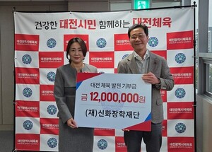 (재)신화장학재단(이사장 김영미)이 대전 체육의 미래를 이끌 인재 양성을 위해 1200만 원의 발전기금을 쾌척하며 지역 사회에 온기를 더하고 있다.대전시체육회는 신화장학재단이 17일 대전체육 발전기금 1200만 원을 기탁했다고 밝혔다.이날 열린 기탁식에는 김영미 신화장학재단 이사장과 이승찬 대전체육회장 등 관계자들이 참석했다. 전달된 기탁금은 지역 내 유망주 발굴과 육성, 생활체육 활성화 등 체육 저변을 확대하는 데 쓰일 계획이다.김영미 이사장은 “지역 체육 인재들이 꿈을 실현하는 데 보탬이 되길 바란다”며 “대전 체육의 밝은 미래