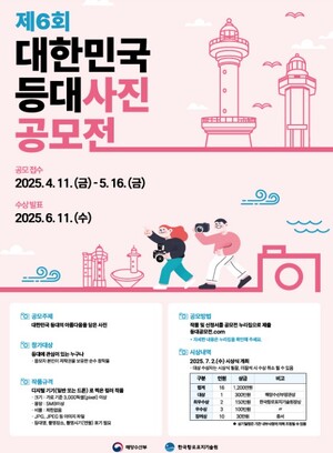 해양수산부는 등대의 역사적, 문화적 가치를 널리 알리고 등대에 대한 국민적 관심을 높이기 위해 '제6회 대한민국 등대 사진 공모전'을 개최한다고 밝혔다.등대에 관심 있는 국민 누구나 참여 가능하며, 대한민국의 아름다운 등대를 담은 사진을 5월 16일까지 공모전 공식 홈페이지(등대공모전.com)에 제출하면 된다.해양수산부는 전문가 심사와 표절 여부 확인 등을 거쳐 6월 11일(수)에 최종 수상작을 발표할 예정이다.공모에 관한 자세한 내용은 공모전 공식 홈페이지와 등대와 바다 홈페이지(등대와바다.com)에서 확인할 수 있다.공모전 시상