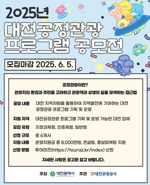 대전시와 대전관광공사가 5월 19일부터 6월 5일까지 대전의 다양한 지역자원을 활용한 ‘2025년 대전공정관광 프로그램 공모전’을 개최, 지속가능한 관광 모델 발굴에 나선다.올해 공모전은 모집유형을 다각화해 ‘지속가능한 대전형 공정관광’에 초점을 맞췄다.모집유형은 △지정과제형 △인증제형 △일반형으로 구분된다. ‘지정과제형’은 ‘반딧불이 불빛체험과 팜스테이’ 또는 ‘0시 축제와 팜스테이’ 내용을 포함한 1박 2일형 프로그램을 기획해야 한다.‘인증제형’은 대전에서 우수하게 공정관광 프로그램을 운영했던 업체의 축적된 경험과 운영 역량을