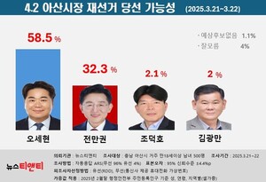오는 4월 2일 치러지는 아산시장 재선거를 앞두고 실시한 여론조사에서 오세현 (전)아산시장이 당선가능성 1위로 나타났다.정당지지도는 더불어민주당 45%, 국민의힘 28.2%로 조사됐다.이번 조사는 지역 언론사 뉴스티앤티가 여론조사 전문기관 (주)데일리리서치에 의뢰해 지난 21일과 22일 이틀간 아산시 거주 만 18세 이상 남녀 500명을 대상으로 실시했다.조사 결과 '지지하는 후보를 떠나서 누가 당선될 것으로 예상하느냐'는 질문에 오세현 (전)아산시장은 58.5%로 1위를 차지했다.이어 전만권 (전)천안시 부시장이 32.3%, 조덕