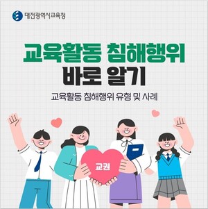 [카드뉴스] 대전시교육청 '교육활동 침해행위 바로 알기'- 교육활동 침해행위 유형 및 사례 ■ 교육활동 침해행위란?학생 또는 그 보호자 등이 교육활동 중인 교원에 대한 교원지위법 제19조 각 호에 규정된 행위를 하는 것 ■ 교육활동 침해행위의 종류는?공무(업무)방해 / 무고 / 상해폭행 / 협박 / 명예훼손, 모욕 / 손괴 / 성희롱, 성폭력범죄 / 불법정보 유통행위 / 악성민원 / 반복적 부당한 간섭 / 무단배포 / 정당한 생활지도에 불응하여 의도적으로 교육활동 방해 등 ■ 이런 것이 교육활동 침해행위입니다.▶ 상해·폭행 신체적