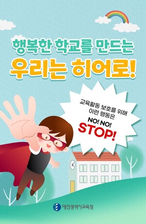 [카드뉴스]대전시교육청 '행복한 학교를 만드는 우리는 히어로!'- 교육활동 보호를 위해 이런 행동은 NO! NO! STOP! ■ 모두가 행복한 학교를 만들기 위해 이런 행동은 안 돼요!- 선생님께 물건을 던지거나 부수는 행동 금지!- 선생님께 욕을 하거나 수업을 방해하는 행동 금지!- 선생님을 성희롱, 성추행하는 행동 금지!- 선생님의 명예를 손상시키는 행동 금지!교육활동 침해행위의 가장 큰 피해자는 바로 여러분입니다. ■ 심심하다고? 이런 행동은 안 돼요!(학생1) 수업이 재미 없어서 연필로 책상을 두드렸어요. 혼자 노는 건데 뭐
