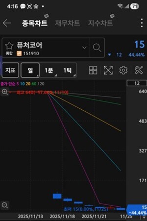 25일, 여러 악재가 겹치며 52주 신저가를 기록한 종목들은 다음과 같다.◆ 퓨처코어 (-44.44%, 15원)광학필터 전문기업 퓨처코어는 상장폐지를 앞두고 정리매매가 진행되면서 주가가 큰 폭으로 하락하며 신저가를 기록했다. 이는 모기업인 쌍방울그룹 전 회장의 횡령·배임 혐의에 따른 상장폐지 결정의 여파다.◆ 닷밀 (-5.91%, 2,150원)실감미디어 기술 기업 닷밀은 2024년 11월 코스닥 시장에 상장한 이후 주가가 하락세를 보이며 52주 신저가를 경신했다. 상장 초기 시장의 높은 기대감에 미치지 못하는 주가 흐름이 이어지고