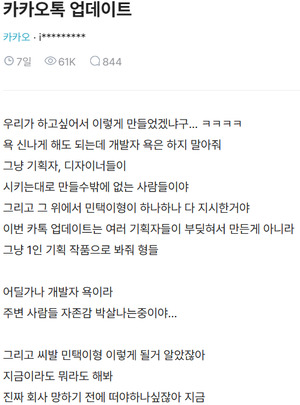 카카오가 메신저 카카오톡을 소셜네트워크서비스(SNS) 허브로 확장하기 위해 단행한 대규모 업데이트가 결국 거센 반발에 부딪혔다. 이용자 불편은 물론 사내 실무자들의 불만까지 이어지면서, 회사는 긴급하게 기존 구조로 되돌리겠다고 밝혔다.이번 개편은 '친구 목록' 중심이던 기존 카카오톡을 피드형 방식으로 전환해, 친구의 활동·게시물이 노출되는 구조로 바꾼 것이 핵심이었다.그러나 업데이트 직후 앱스토어에는 메신저 본질을 훼손했다, 광고를 위한 개편 아니냐는 항의성 후기가 잇따랐고, 피드 화면에 대한 불편과 피로감을 호소하는 목소리가 커졌