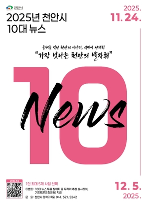 천안시는 다음 달 5일까지 ‘2025년 천안시 10대뉴스’ 온라인 시민투표를 진행한다.이번 투표는 ‘올해를 빛낸 천안의 이야기, 시민이 선택한 가장 빛나는 발자취’라는 부재 아래, 시민이 직접 올 한 해 시정 주요 성과를 선정한다.온라인 투표는 정보무늬(QR코드)를 통해 시민 누구나 참여할 수 있으며, 천안시 시책 32개 중 개인별로 최대 5개까지 선택할 수 있다.시는 이번 투표를 통해 시민의 공감을 많이 끌어낸 우수 시책 10건을 최종 선정할 계획이다.온라인 투표 결과는 다음 달 8일 공식 블로그를 통해 발표할 예정이다.김석필 천