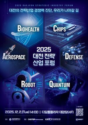 대전시는 대전과학산업진흥원(DISTEP), 한국화학연구원(KRICT)과 함께 오는 12월 2일 오후 2시 한국화학연구원 디딤돌플라자 4층 대강당에서 '2025년 대전 전략산업 통합포럼'을 개최한다.이번 포럼은 시가 중점 육성 중인 6대 전략산업(ABCD+QR)의 지역맞춤형 육성전략을 마련하고, 산·학·연·관·군이 함께하는 협력 생태계 구축을 위한 소통의 장을 위해 마련했다.'대전의 전략산업 경쟁력 진단, 우리가 나아갈 길'을 주제로 열리는 포럼은 대전투자금융 송원강 대표의 특별강연을 시작으로 ▲ 우주항공 ▲ 바이오헬스 ▲ 반도체 ▲