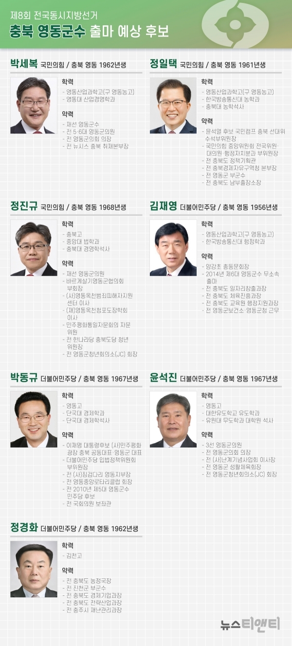 2022년 6.1 지방선거를 정확히 204일 앞두고 충북 영동군수 출마 예상자로 자천타천 거론되는 인사들은 7명 정도로 알려졌다.