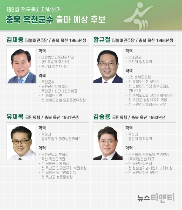2022년 6.1 지방선거를 정확히 176일 앞두고 충북 옥천군수 출마 예상자로 자천타천 거론되는 인사들은 4명 정도로 알려졌다.