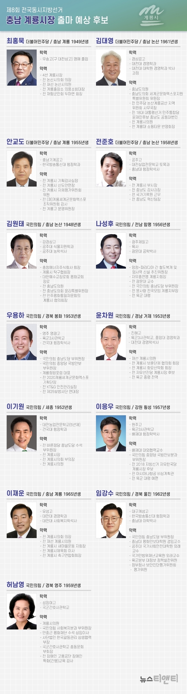 안교도 전 계룡시 기획관리실장도 다시 한 번 출사표를 던졌다. 안 전 실장은 지난 2018년 6.13 지방선거 당시 더불어민주당에서 주최하는 정치아카데미에 빠짐없이 참석하는 등 만만의 준비를 통해 자신이 모시던 최홍묵 시장에게 도전장을 내밀었으나, 정치신인 가산점 10%를 받고도 더불어민주당 경선 문턱에서 현역 프리미엄이라는 강고한 지지 기반을 갖고 있는 최홍묵 시장의 벽을 넘지 못하고 憤淚(분루)를 삼킨 바 있다. 경선 패배 후 최홍묵 시장의 당선을 위해 기여한 안 전 실장은 4년 동안 꾸준히 지역민과의 스킨십을 강화하면서 내년 6.1 지방선거를 대비해 온 것으로 알려졌다. 안 전 실장은 계룡고 운영위원장과 (재)계룡세계군문화엑스포 조직위원회 감사 그리고 계룡시 자체평가위원회 위원과 계룡시 신도안면장 등을 역임했다. 안 전 실장은 기자와의 통화에서 “‘시민과 함께하는 행복한 계룡 건설’이라는 슬로건 아래 지역을 발전시키는 것이 제 꿈이자 목표라”면서 “계룡시의 4개 권역을 ▲ 두마권 ‘지역상생 전진기지’ ▲ 엄사권 ‘문화관광중심기능 특화’ ▲ 신도안권 ‘국방문화 메카’ ▲ 금암권 ‘공공서비스 중심’으로 개발해 새로운 계룡을 만들겠다”는 포부를 보였다.