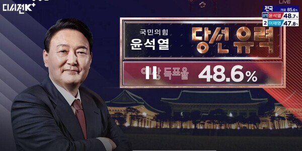 국민의힘 윤석열 후보가 20대 대통령 당선이 유력한 것으로 나타났다.