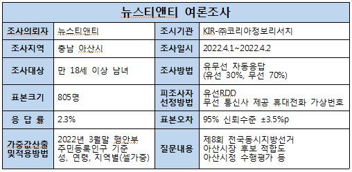 뉴스티앤티가 여론조사 전문기관 코리아정보리서치에 의뢰해 지난 1~2일 아산 거주 만 18세 이상 남녀 805명을 대상으로 실시한 전화 설문조사에서 '차기 아산시장 국민의힘 후보로 누가 더 적합한가'를 묻는 질문에 박경귀 현 국민의힘 아산을 당협위원장 23.1%, 전만권 전 천안부시장 17.5% 순으로 조사됐다.