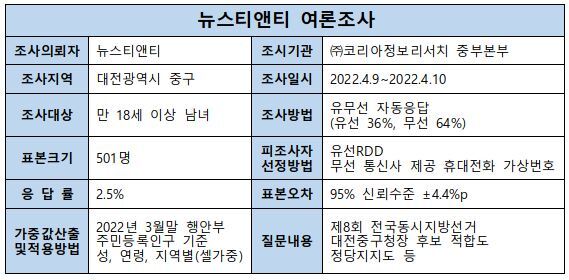 뉴스티앤티가 여론조사 전문기관 (주)코리아정보리서치 중부본부에 의뢰해 지난 지난 9~10일 대전 중구 거주 만 18세 이상 남녀 501명을 대상으로 실시한 전화 설문조사에서 이와 같이 조사됐다.