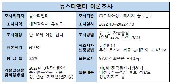 뉴스티앤티가 여론조사 전문기관 (주)코리아정보리서치 중부본부에 의뢰해 지난 지난 9~10일 대전 유성구 거주 만 18세 이상 남녀 602명을 대상으로 실시한 전화 설문조사에서 이와 같이 나타났다.