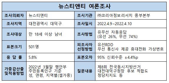 뉴스티앤티가 여론조사 전문기관 (주)코리아정보리서치 중부본부에 의뢰해 지난 지난 9~10일 대전 대덕구 거주 만 18세 이상 남녀 501명을 대상으로 실시한 전화 설문조사에서 이와 같이 나타났다.