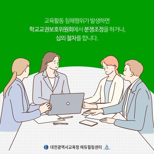 교육활동 침해행위가 발생하면 학교교권보호위원회에서 분쟁조정을 하거나, 심의 절차를 진행합니다.