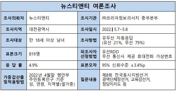 뉴스티앤티가 여론조사 전문기관 (주)코리아정보리서치 중부본부에 의뢰해 지난 7~8일 대전 거주 만 18세 이상 남녀 819명을 대상으로 전화 설문조사를 실시한 결과 이와 같이 조사됐다.