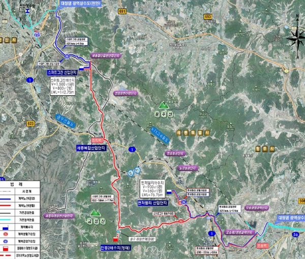 이번에 설치하는 공업·생활용수 용수관은 한국수자원공사 대청댐 광역상수도(청주 오송, 천안 목천읍)에서 분기하여 총 연장 44.5㎞의 생활·공업 용수관로(D100~300mm), 배수지 4곳, 가압 펌프장 4곳을 시비 450억 원을 투입해 단계적으로 설치하는 대규모 프로젝트다.