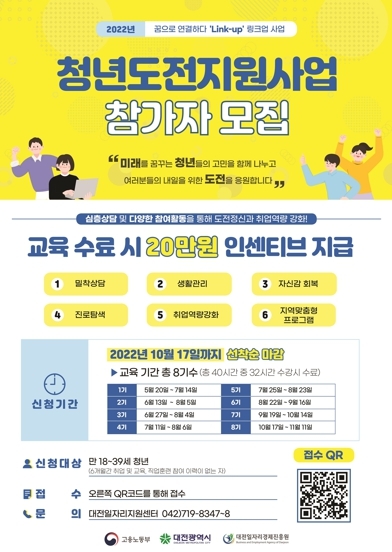 대전시가 구직활동 중단 등 취업에 어려움을 겪고 있는 청년들의 원활한 사회활동 지원 및 구직의욕 고취를 위해 ‘청년도전 지원사업’7, 8기 참여 대상자를 확대 모집한다.