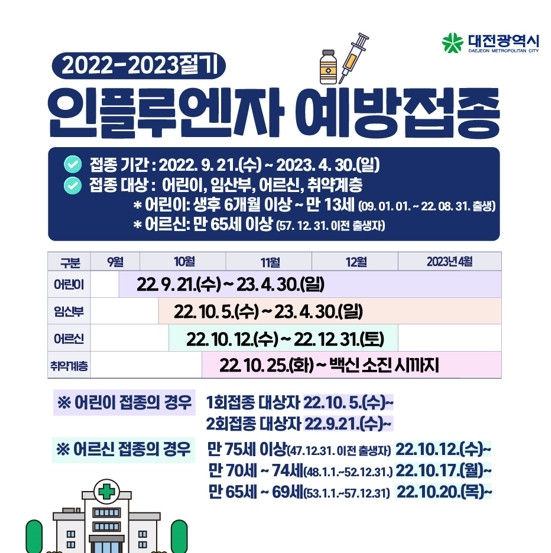 대전시가 오는 21일 어린이를 시작으로 임신부, 만 65세 이상 어르신, 취약계층에 대한 인플루엔자 예방접종을 순차적으로 실시한다.