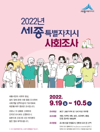 세종시가 오는 19일부터 10월 5일까지 세종시 표본 1,800가구를 대상으로 ‘세종특별자치시 사회조사’를 실시한다.