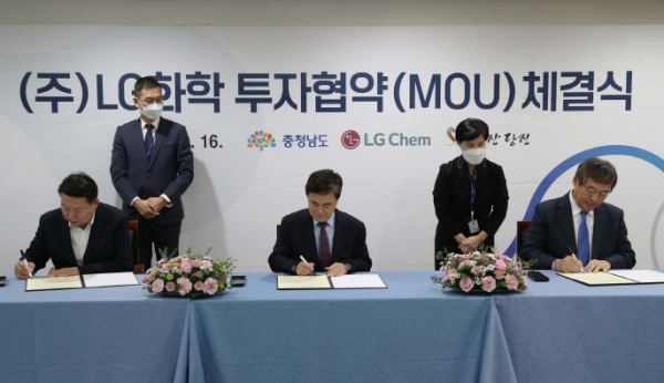 김태흠 지사는 16일 도청 상황실에서 LG화학 대표이사 신학철 부회장, 오성환 당진시장과 투자협약(MOU)을 체결했다.