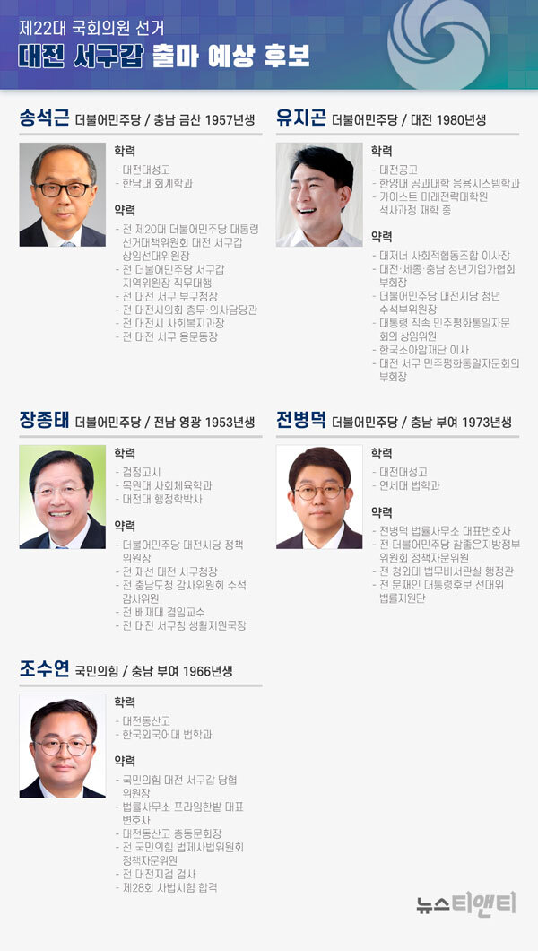 22대 총선을 302일 앞두고 대전 서구갑 국회의원 후보로 자천타천 거론되는 인물은 5명 정도로 알려졌다.