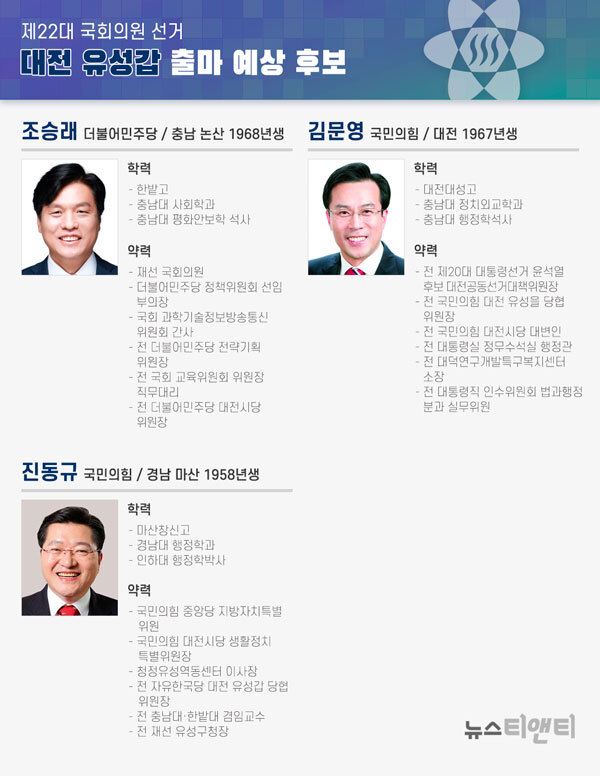 ‘유성 토박이’를 강조하는 김문영 전 대통령비서실 행정관도 출마 의지를 보이는 것으로 알려졌다. 지난 1995년 민주자유당 공채 4기로 정계에 발을 디딘 김문영 전 행정관은 2급 상당의 국회정책연구위원을 거쳐 이명박 정부 대통령비서실 행정관과 대덕연구개발특구복지센터 소장 등을 역임했다. 유성에서 태어난 김문영 전 행정관은 초등학교·중학교·대학교도 모두 유성에서 졸업한 강점을 바탕으로 본선 경쟁력을 강조하고 있다. 하지만, 지난 2014년 6.4 지방선거에서 대전시의원에 도전하여 낙선한 바 있으며, 지난 2021년에는 국민의힘 유성을 당협위원장으로 임명되어 20대 대선까지 유성을에서 활동한 바 있어 지역구를 옮기는 점이 부담으로 작용할 전망이다. 특히, 김문영 전 행정관은 유성을 당협위원장이라는 프리미엄을 안고 있으면서도 지난해 6.1 지방선거 국민의힘 유성구청장 경선에서 진동규 전 유성구청장에게 패배하며 다시 한 번 본선 진출에 실패하면서 체면을 구긴 바 있다. 무엇보다도 김문영 전 행정관은 지역에서 제기되고 있는 모든 선거에 출마한다는 비판을 어떻게 잠재우느냐가 급선무로 보인다.