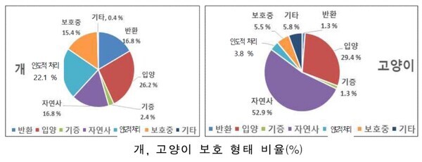 구조동물 중 3만1,182마리(27.5%)가 입양돼 가장 큰 비중을 차지했고, 자연사한 경우가 3만490마리(26.9%)로 뒤를 이었다. 이어 인도적 처리(안락사) 1만9,043마리(16.8%), 소유주 반환 1만4,031마리(12.4%), 보호 중 1만4,157마리(12.5%) 순이었다.
