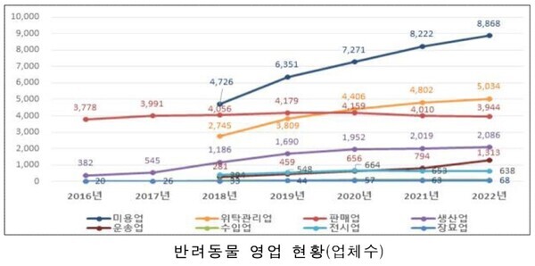 반려동물 영업장은 전년 대비 6.7% 증가한 2만2,076개소로 집계됐다. 동물생산업, 장묘업, 수입업, 미용업, 운송업, 위탁관리업은 증가하고 동물판매업, 전시업은 감소했다. 영업장 종사자수는 4.9% 증가한 2만6,093명으로 조사됐다.