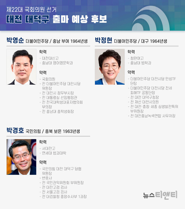 22대 총선을 204일 앞두고 대전 대덕의 국회의원 후보로 자천타천 거론되는 인물은 3명 정도로 알려졌다.
