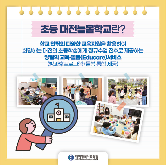 학교 안팎의 다양한 교육자원을 활용하여 희망하는 대전의 초등학생에게 정규수업 전후로 제공하는 양질의 교육·돌봄(Educare)서비스