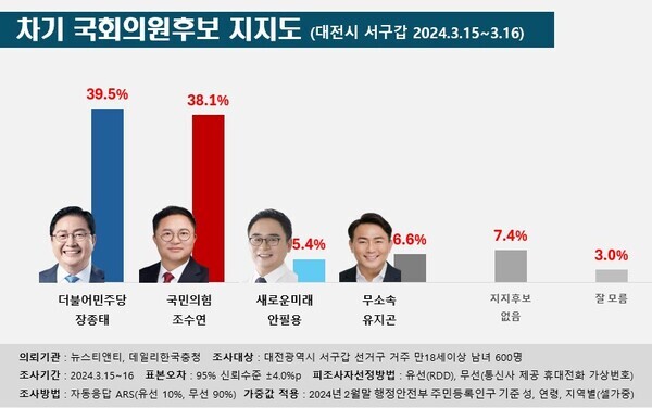 민주 장종태(39.5%), 국힘 조수연(38.1%), 무소속 유지곤(6.6%), 새로운미래 안필용(5.4%) 순
