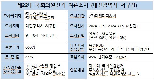 이번 조사는 지역 언론사 뉴스티앤티와 데일리한국충청이 여론조사 전문기관 (주)데일리리서치에 의뢰해 지난 15~16일 대전시 서구갑 선거구 거주 만 18세 이상 남녀 600명을 대상으로 실시했다.