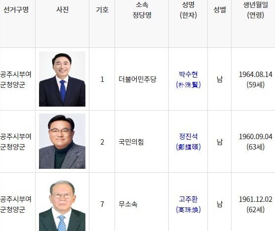 이날 중앙선거관리위원회 선거시스템에 따르면 '당진시' 선거구에서는 더불어민주당 박수현(59), 국민의힘 정진석(63), 무소속 고주환(62) 등 3명이 출마한다.