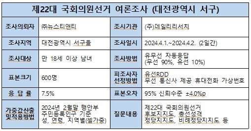 이번 조사는 지역 언론사 뉴스티앤티가 여론조사 전문기관 (주)데일리리서치에 의뢰해 선거 여론조사 결과 공표금지기간 전인 지난 1일과 2일 이틀간 대전시 서구을 선거구 거주 만 18세 이상 남녀 600명을 대상으로 실시했다.