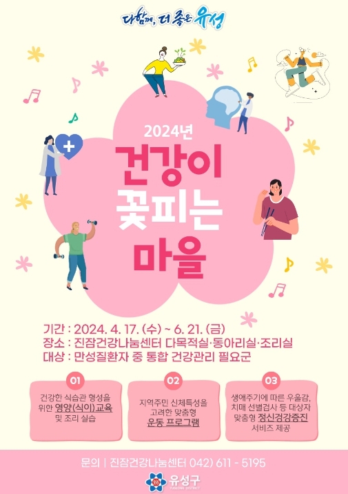 대전 유성구가 이달 17일부터 오는 6월 21일까지 10주간 영양·신체활동·정신건강을 통합한 진잠지역의 대표적인 마을건강 프로그램, ‘건강이 꽃피는 마을’을 운영한다.