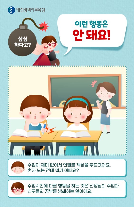 - 선생님께 욕을 하거나 수업을 방해하는 행동 금지!
