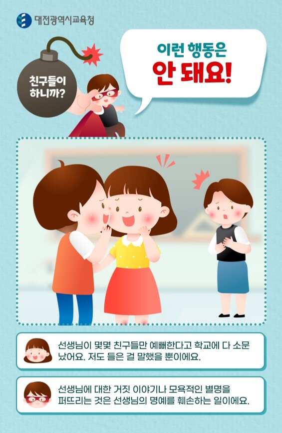 (히어로) 선생님에 대한 거짓 이야기나 모욕적인 별명을 퍼뜨리는 것은 선생님의 명예를 훼손하는 일이에요.