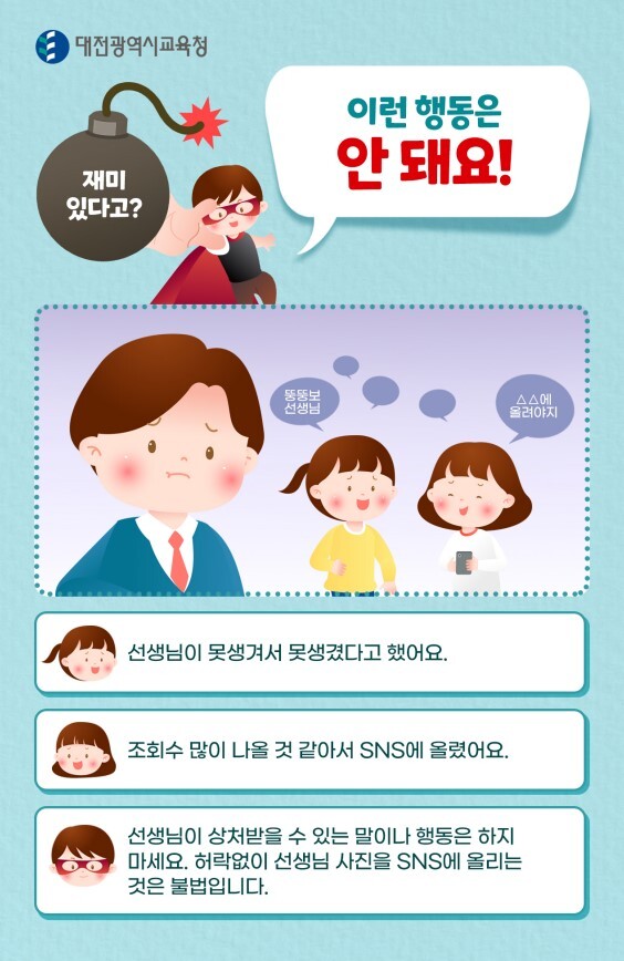 (히어로) 선생님이 상처받을 수 있는 말이나 행동은 하지 마세요. 허락없이 선생님 사진을 SNS에 올리는 것은 불법입니다.