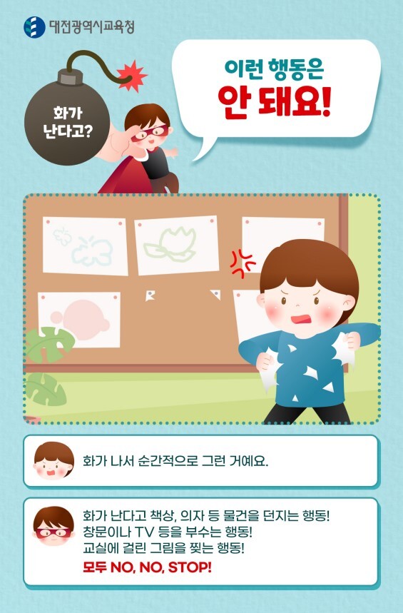 (히어로) 화가 난다고 책상, 의자 등 물건을 던지는 행동! 창문이나 TV 등을 부수는 행동! 교실에 걸린 그림을 찢는 행동! 모두 NO, NO, STOP!
