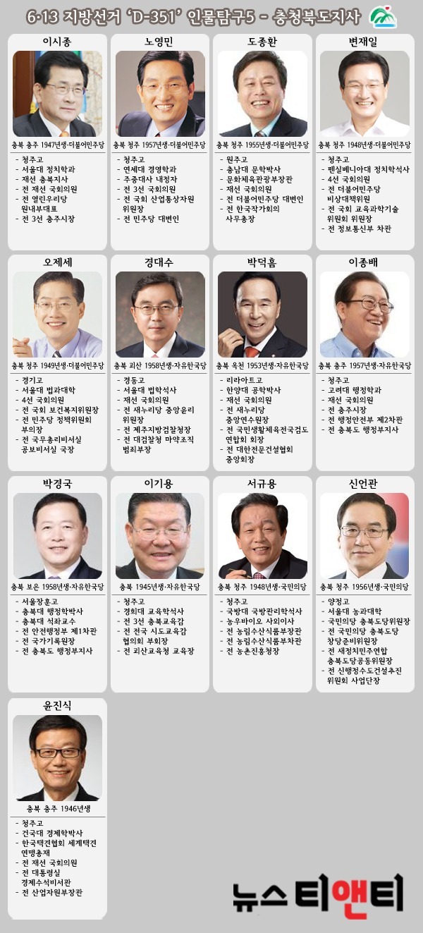 지방선거를 344일 앞두고 자천타천으로 충북지사에 거론되는 인사들은 10여명을 넘어서고 있다. 박근혜 전 대통령 탄핵 이후 원내 5당 체제가 형성되면서 남은 기간 어떤 변수들이 발생할지 알 수 없으나, 주요 변수는 다음의 5가지 정도로 요약할 수 있다. 첫째는 이시종 지사가 3선 출마를 강행할지, 둘째는 선거 막판 보수와 진보가 단일대오를 형성할지, 셋째는 문재인 대통령의 집권 초기 고공 행진을 이어가고 있는 더불어민주당의 지지율이 계속될지, 넷째는 북핵 위기가 심화될지, 다섯째는 문재인 대통령이 공약한 개헌 추진 등이다.