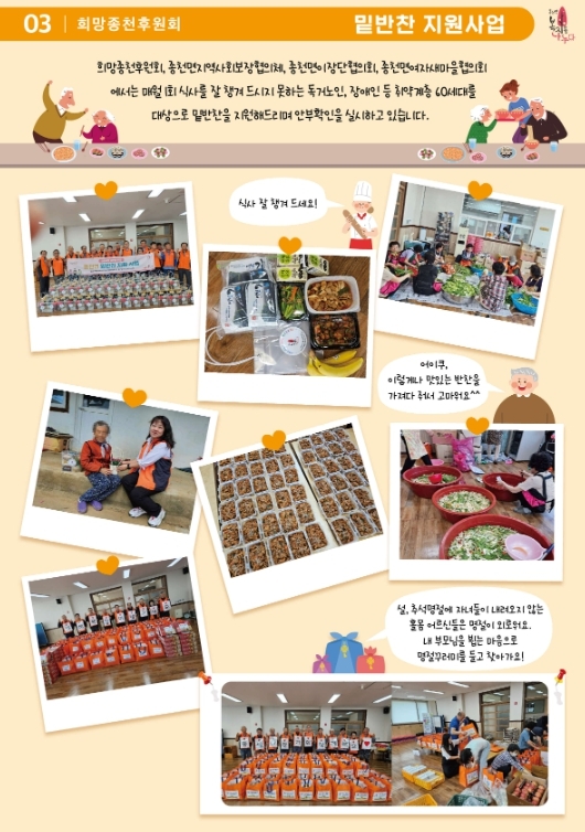 소식지 표지는 종천면 치유의 숲 겨울 전경으로 장식해 지역의 아름다움을 담아냈으며, 내용에는 어르신 밑반찬 지원 사업, 김장 나눔, 보행 보조기 지원 등 후원회가 추진해 온 주요 사업들을 자세히 소개했다. 이를 통해 지역 주민들에게 후원회의 활동을 알리고, 복지 사업에 대한 이해를 높이는 데 기여할 것으로 기대된다.