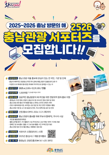 도 관계자는 “2526 충남관광 서포터즈를 통해 2025∼2026충남 방문의 해를 전국에 더 널리 알리고 충남 관광이 한 단계 더 발전할 수 있도록 많은 관심과 참여를 부탁드린다”라고 말했다.