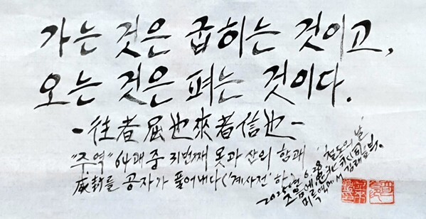 이번 ‘글자그림 이야기’는 자작시 한 편과 철도와 관련된 웅숭깊은 글귀 몇 개를 소개할까 합니다. 기차여행 경험들 많으실 터라 중언부언하는 듯싶어서요. 우선 철도鐵道 의 ‘길 道’와 ‘하나 一’의 연관성을 살펴보겠습니다. 기원전 중국 상나라 전설의 태호太皞 복희씨伏羲氏가 먼저 ‘一’을 그리고, 그것을 나누면서 8괘(하늘, 못, 불, 우레, 바람, 물, 산, 땅)를 만들었는데 태극기의 4괘가 바로 일부입니다. 훗날 주대의 문왕이 이 8개의 상象을 중첩해 64괘를 그렸는데『주역』으로 전해지고 있습니다.