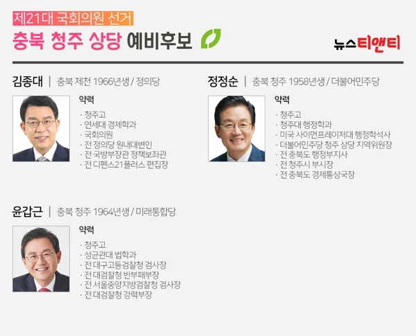 충북 정치 1번지 청주 상당은 1996년 15대 총선부터 청주 상당 선거구로 명칭이 붙여진 이후 여섯 차례의 진보진영과 보수진영이 나란히 세 차례씩 당선자를 배출했을 정도로 팽팽한 접전을 벌인 지역이다. 최근 두 차례의 총선에서는 미래통합당 정우택 후보가 청주 네 개 선거구 중 유일하게 당선되면서 보수진영이 체면치레를 한 지역이다. 하지만 지난 6.13 지방선거에서 더불어민주당이 청주시장을 비롯한 지방권력을 장악하면서 이번 총선에서의 판도는 알 수 없는 사황이다. 또한 이번 21대 총선에서는 3명의 후보 모두 청주고 출신 동문들로 고교 동문들의 표심 또한 당락의 관건으로 작용할 전망이다.