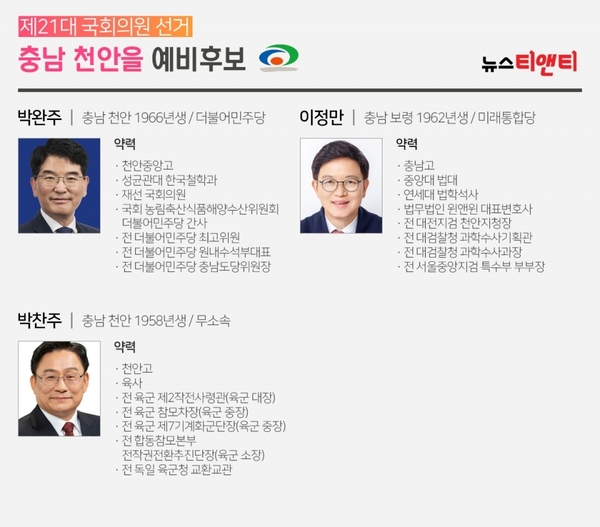 박완주 의원 vs 이정만 예비후보 vs 박찬주 예비후보