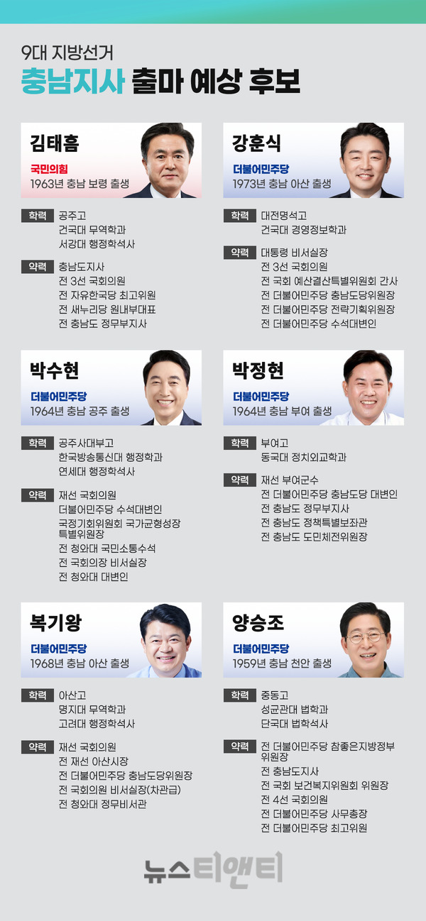 ‘어게인 2018년’을 꿈꾸는 더불어민주당과 ‘어게인 2022년’을 꿈꾸는 국민의힘의 乾坤一擲(건곤일척) 승부가 예상되는 2026년 6.3 지방선거에서 3년 만에 정권을 탈환한 더불어민주당에는 후보군이 넘쳐 나지만, 6.3 조기 대선 패배 이후 찬탄파 vs 반탄파의 극렬한 대립으로 당 내홍이 격화되고 있는 국민의힘의 경우 현역 프리미엄을 안고 있는 김태흠 지사 단 한 명만 거론될 정도로 경쟁률이 낮은 편이다.