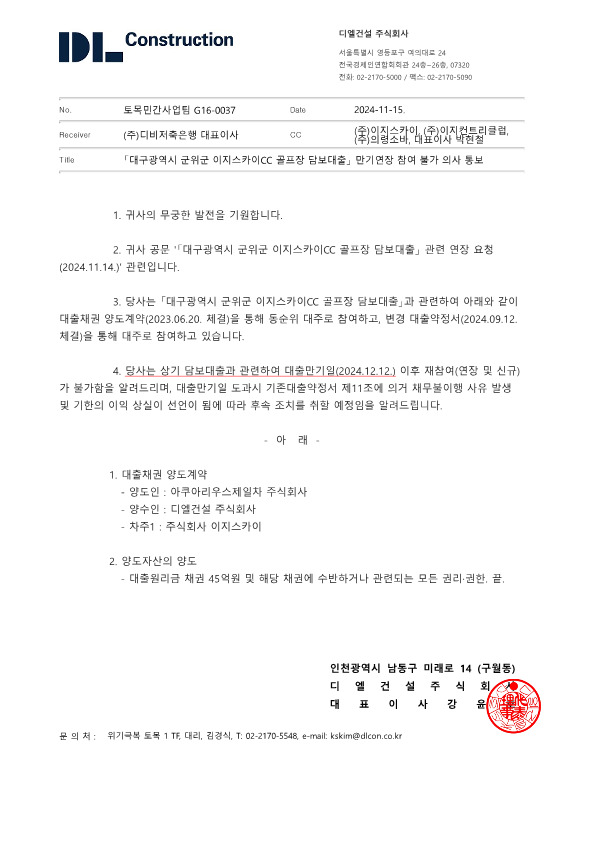 디엘건설은 11월 15일자 공문에서 “2023년 6월 26일 질권 등 동등 담보권 합의서, 2024년 9월 12일 변경 대출약정을 통해 대주로 참여 중”이라며 “상기 담보대출과 관련해 만기 이후 재협의(연장·신규)는 불가하다”고 밝혔다.