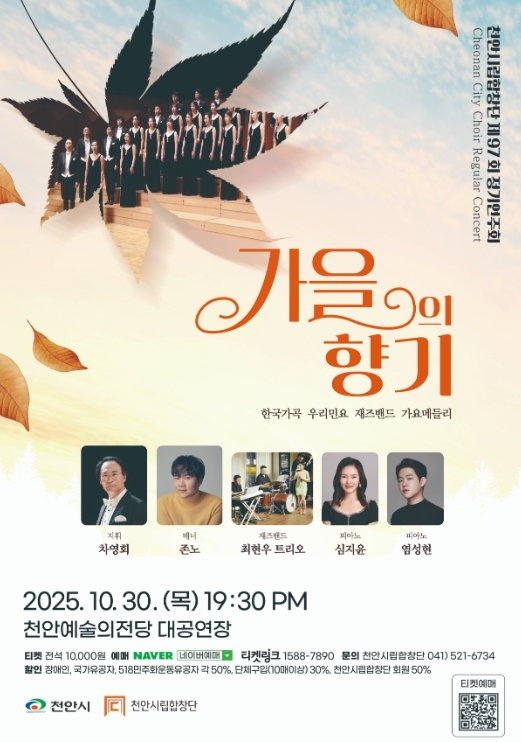 천안시립합창단이 오는 30일 오후 7시 30분 천안예술의전당 대공연장에서 제97회 정기연주회 ‘가을의 향기’를 개최한다.